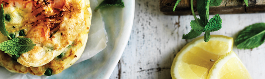 Place the flour, baking powder, eggs & buttermilk into a bowl, season with salt & pepper, whisk until smooth. Peel & devein prawns, halve lengthways. Add peas, lemon & prawns, mix to combine.